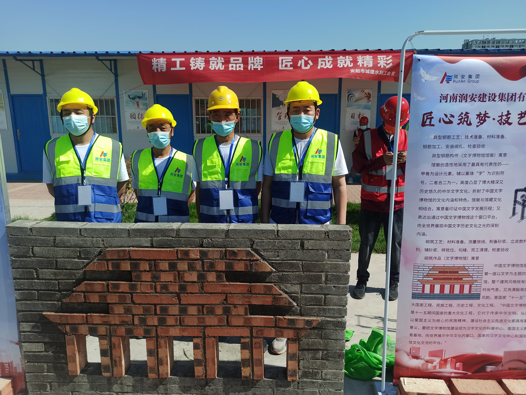 本次技能展示活動設置了鋼筋綁扎和砌筑兩個項目,我公司派遣八名職工代表參加了本次技能展示,選手們身著統(tǒng)一工作服,以嫻熟的操作技能展現(xiàn)了過硬的技術水平。砌筑工速度與質量并重,一手拿著泥刀,一手不停地一塊塊砌磚,每一道工序、每一個細節(jié)都力求做到完美,最終圓滿完成了砌筑作品《文字博物館》。鋼筋工粗中有細,在大面積作業(yè)的同時,即時進行細節(jié)處理,確保作品垂直、平整,經過一系列的復雜操作,一個完美的安陽文字博物館館徽便呈現(xiàn)在眼前。高超的技藝水平贏得了領導和現(xiàn)場觀眾的一致稱贊。