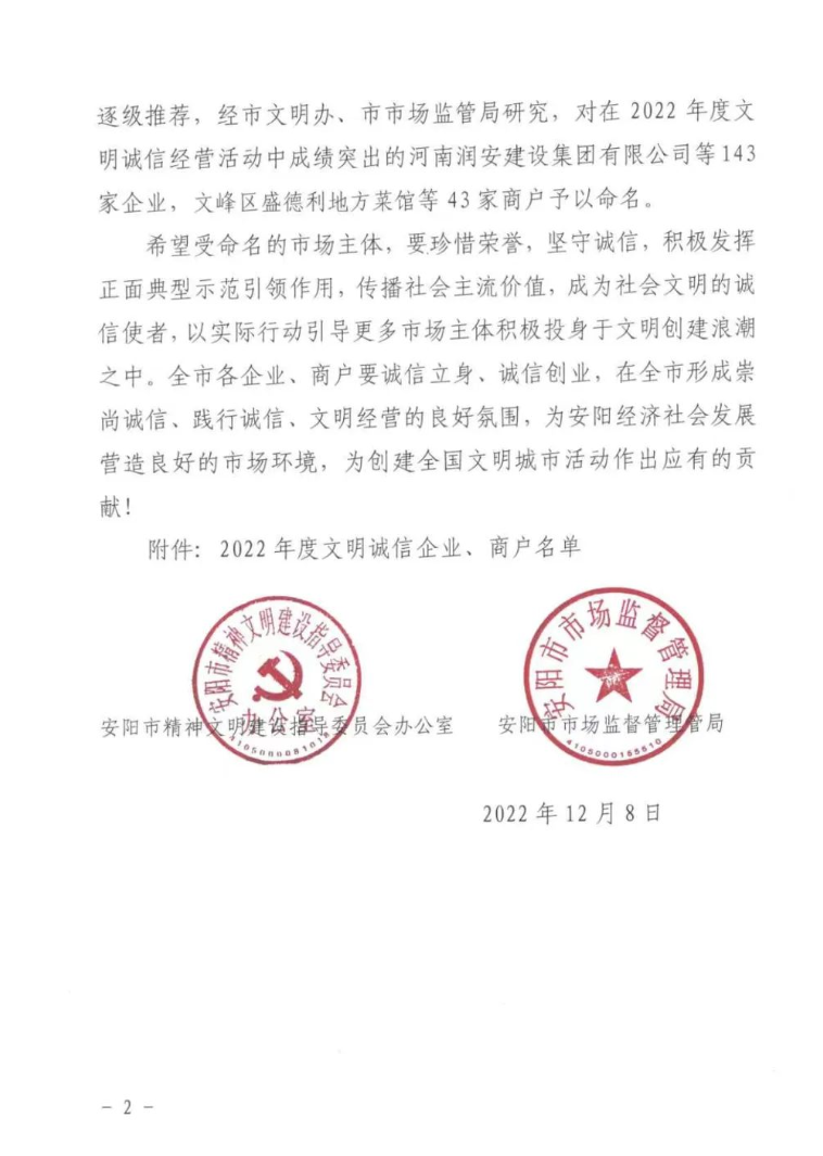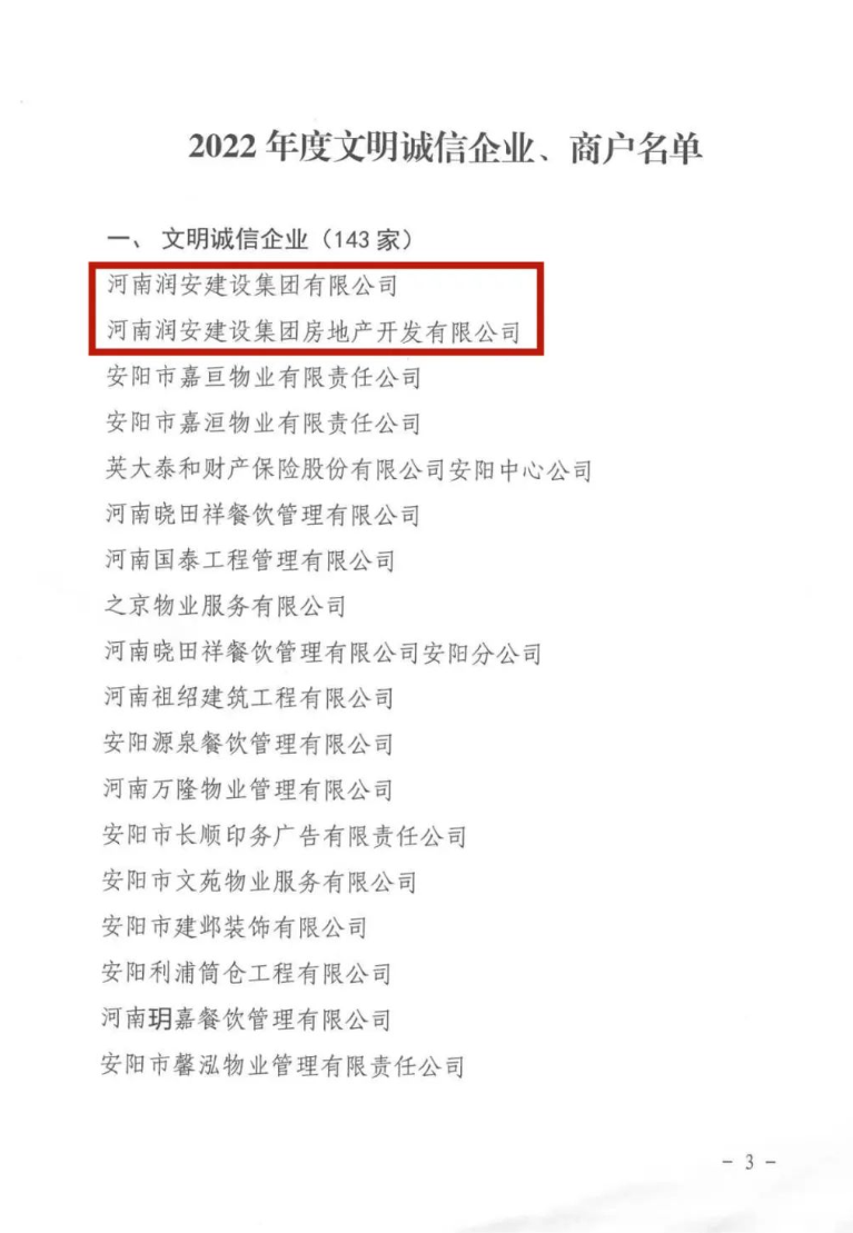 近日,安陽市精神文明建設(shè)指導(dǎo)委員會辦公室、安陽市市場監(jiān)督管理局聯(lián)合印發(fā)《關(guān)于命名2022年度安陽市“文明誠信企業(yè)、文明誠信商戶”的決定》。河南潤安建設(shè)集團有限公司、河南潤安建設(shè)集團房地產(chǎn)開發(fā)公司雙雙榮登“安陽市2022年度文明誠信企業(yè)”榜單,分別名列榜單第1名和第2名。