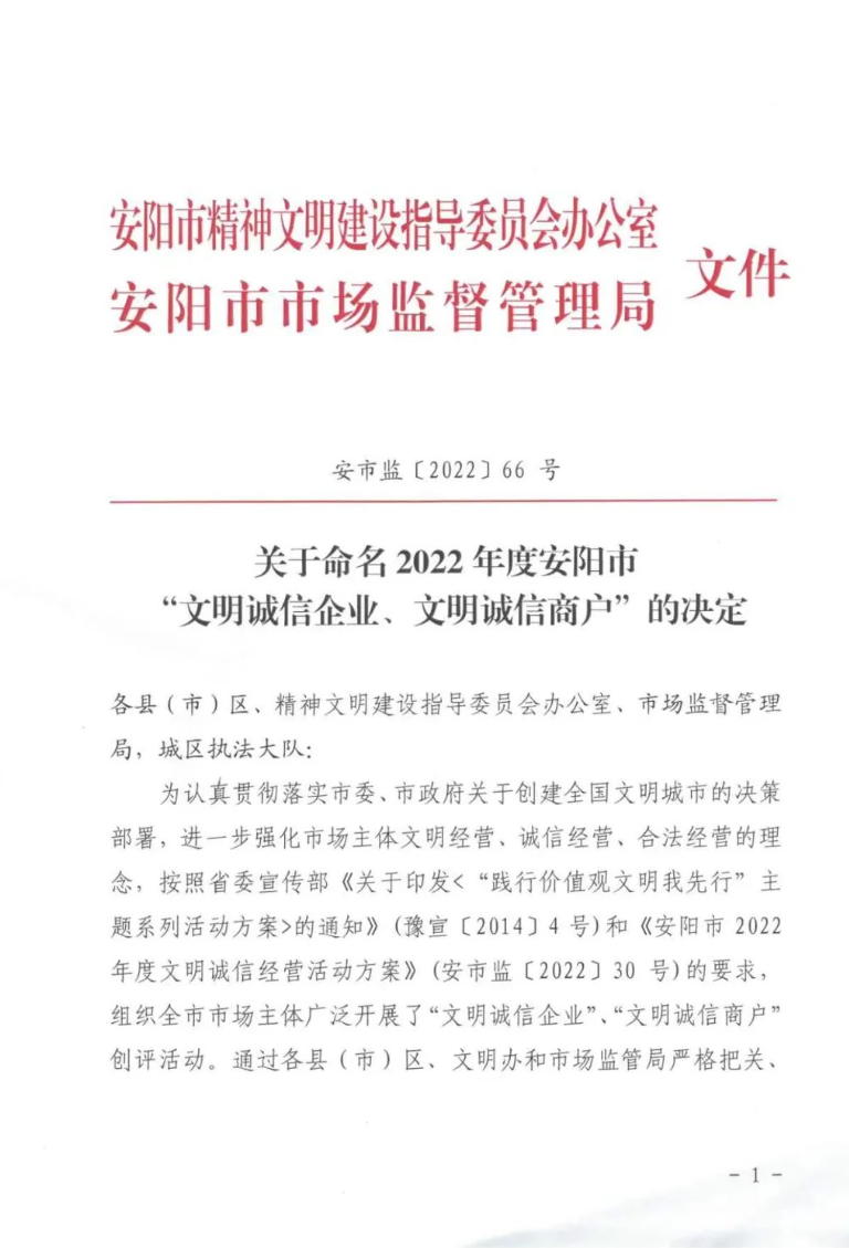 文件指出:為認真貫徹落實市委、市政府關(guān)于創(chuàng)建全國文明城市的決策部署,進一步強化市場主體文明經(jīng)營、誠信經(jīng)營、合法經(jīng)營的理念,組織全市市場主體廣泛開展了“文明誠信企業(yè)”、“文明誠信商戶”創(chuàng)評活動。通過各縣(市)、區(qū)文明辦和市場監(jiān)管局嚴格把關(guān)、逐級推薦,經(jīng)市文明辦、市市場監(jiān)管局研究,對在2022年度文明誠信經(jīng)營活動中成績突出的河南潤安建設(shè)集團有限公司等143家企業(yè)予以命名。具體文件如下: 潤安集團長期以來高度重視企業(yè)信用管理,堅持誠信經(jīng)營,傾力打造“潤安”品牌。此次獲評文明誠信企業(yè),充分說明了潤安集團在企業(yè)信譽、品牌建設(shè)方面得到了社會的高度認可,也必將成為公司高質(zhì)量發(fā)展的強大推動力。 下步,潤安集團將以此次表彰為契機,以習(xí)近平新時代中國特色社會主義思想和黨的二十大精神為指引,時刻保持依法經(jīng)營、誠信納稅的理念,積極發(fā)揮正面典型示范,樹立文明誠信的良好形象,堅持誠信立身、誠信創(chuàng)業(yè),為安陽經(jīng)濟社會發(fā)展營造良好的市場環(huán)境,為創(chuàng)建文明城市助力加油,作出貢獻。