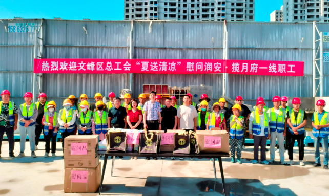 為做好防暑降溫工作,切實(shí)保障一線(xiàn)職工的健康安全。6月15日上午,安陽(yáng)市文峰區(qū)總工會(huì)常務(wù)副主席連繼業(yè)、副主席閆妍一行深入集團(tuán)公司潤(rùn)安攬?jiān)赂?xiàng)目部開(kāi)展“夏送清涼”走訪(fǎng)慰問(wèn)。集團(tuán)公司副董事長(zhǎng)李志超、工會(huì)主席王福民、攬?jiān)赂?xiàng)目總經(jīng)理張帆等對(duì)工會(huì)領(lǐng)導(dǎo)的到來(lái)表示熱烈歡迎。