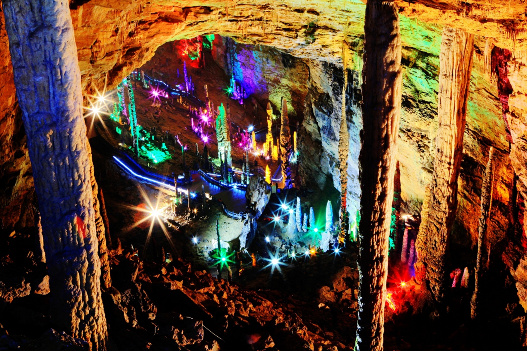 黃龍洞于1984年正式對外開放,現(xiàn)已探明的洞底總面積達10萬平方米,全長7.5公里,垂直高度140米,上下共分四層。其規(guī)模之大、鐘乳石之多、形狀之奇,在國內外溶洞中極為罕見,被中外溶洞專家贊譽為世界溶洞的"全能冠軍"。